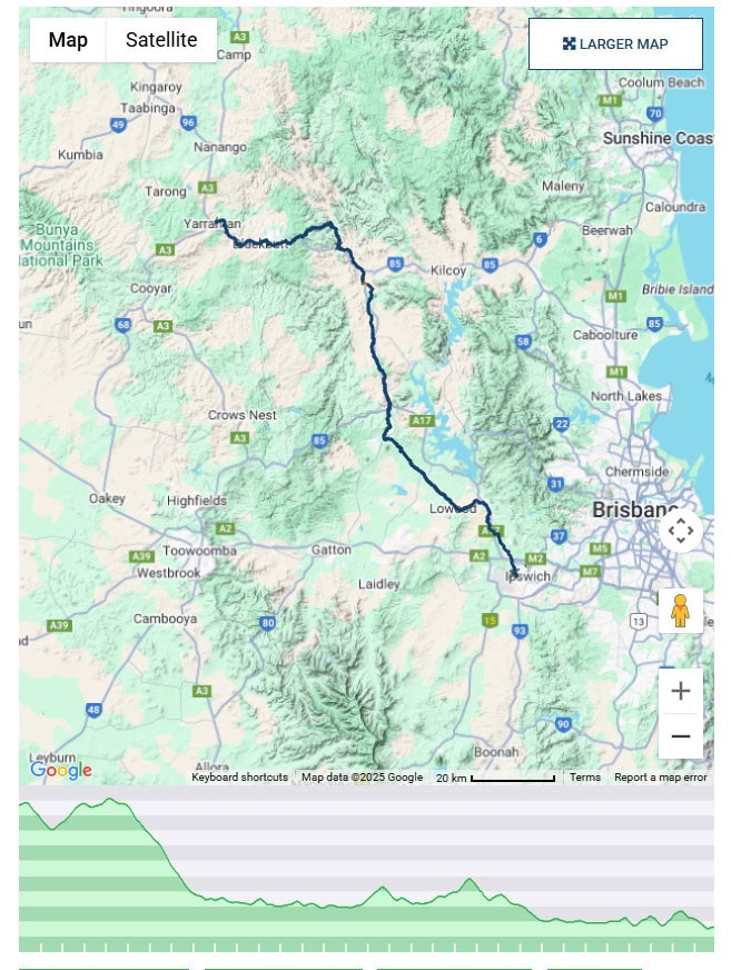 Day 2 from Esk to Fernvale is almost all flat and is 40 km.